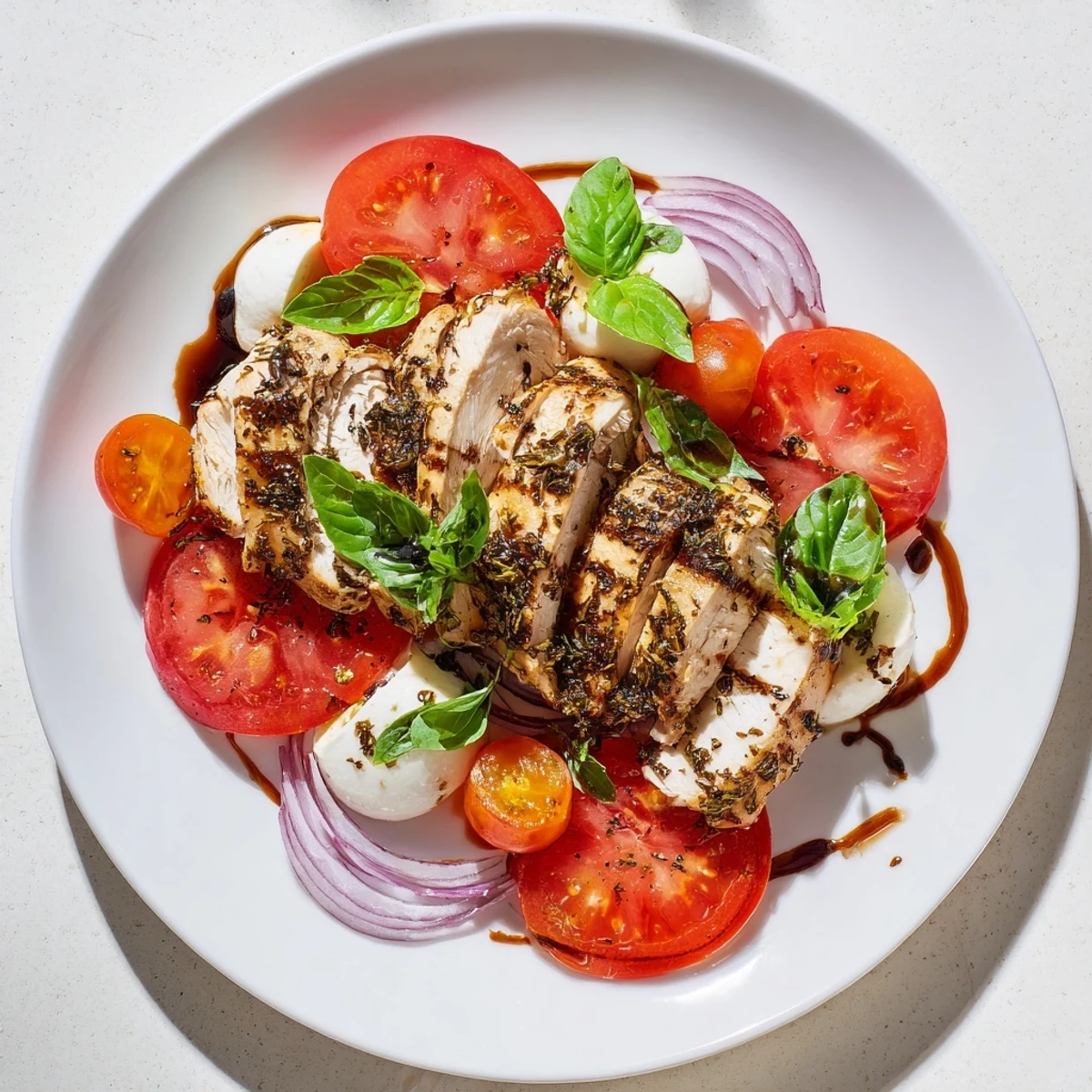Save I learned the hard way that warm salad greens and cold mozzarella create a strange texture if the chicken isn't sliced and arranged quickly. Now I time everything so the components come together at the last moment, and that's when the magic happens—when the warm chicken meets the cool, creamy cheese and fresh basil.