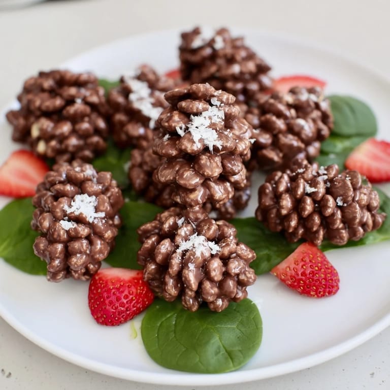 Save A whimsical, crunchy dessert featuring chocolate, Coco Pops, and marshmallows, crafted into pinecone shapes and served as a playful salad for kids and adults alike.