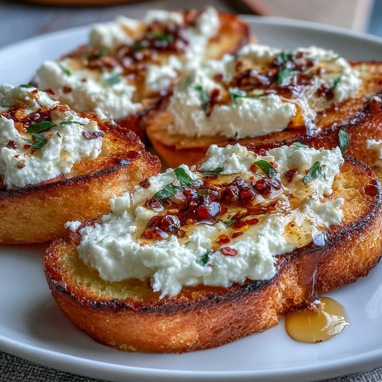 Save Experience the perfect harmony of textures and flavors with these golden crostini. This appetizer brings together the salty tang of Mediterranean feta, the smooth richness of cream cheese, and the bold kick of hot honey, making it a sophisticated addition to any gathering.