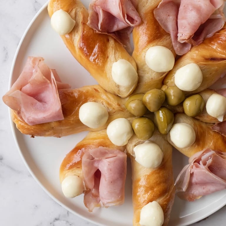 - Now comes the meditative part—arrange your prosciutto slices, mozzarella balls, and pickles in pairs radiating outward from the breadstick base. Think of them as the thickest, strongest branches. Space them with intention, creating a sense of symmetry that feels natural, not rigid. This is where your instincts matter more than perfection.