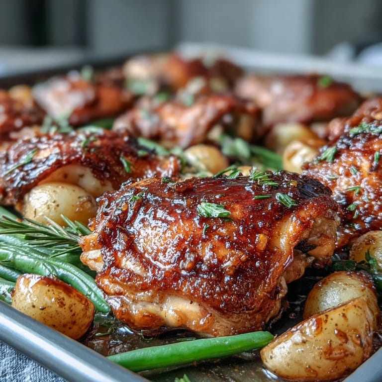 Save When the evening rush hits and you need a dinner that delivers both convenience and flavor, this Honey Garlic Sheet Pan Chicken is your answer. The magic happens when the sticky-sweet honey sauce caramelizes around tender chicken thighs and vegetables, creating a meal that feels like you spent hours in the kitchen—when in reality, your oven did most of the work. The combination of juicy chicken, crisp-tender green beans, and creamy baby potatoes creates a complete meal on a single pan, minimizing cleanup while maximizing satisfaction.