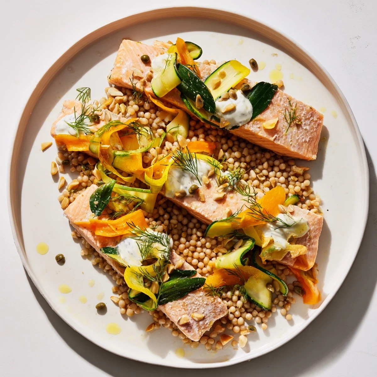- This is the moment everything comes together. Using the cooled couscous as your guide, spoon it into a smooth figure-eight pattern directly on your platter. Now, as if you're painting, arrange your blanched vegetables in an alternating pattern along the loop—a line of zucchini, then carrot, then fennel, then spinach. Let the colors speak. Nestle your beautiful salmon flakes into the curves where they belong. Dot small spoonfuls of your yogurt dressing throughout. Scatter capers sparingly across the entire design. Finish with your toasted pine nuts sprinkled like tiny jewels.