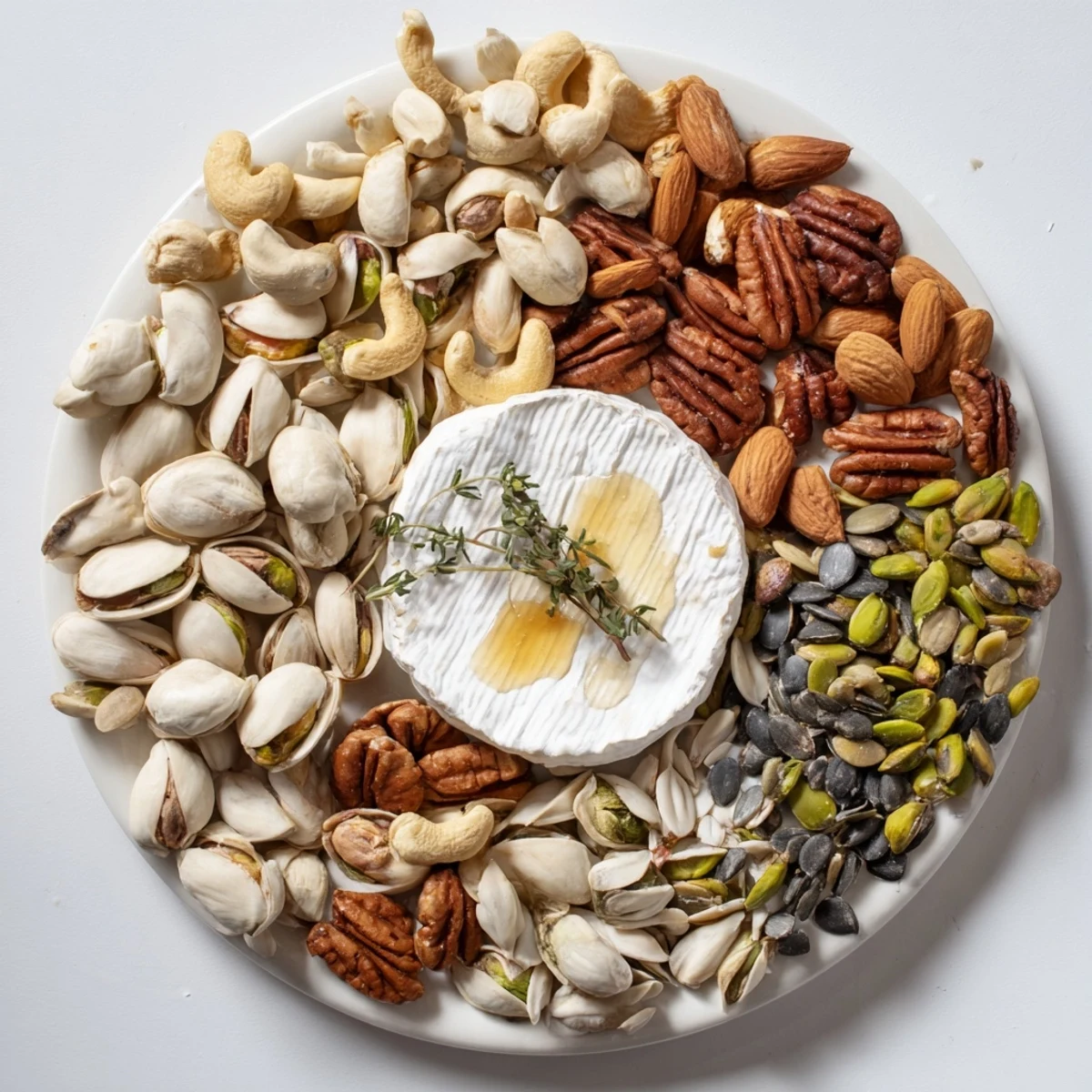- Stay committed to your alternating pattern—switch between different nuts and seeds as you loop inward. The color shifts keep the eye moving and make the whole thing feel deliberate rather than random.