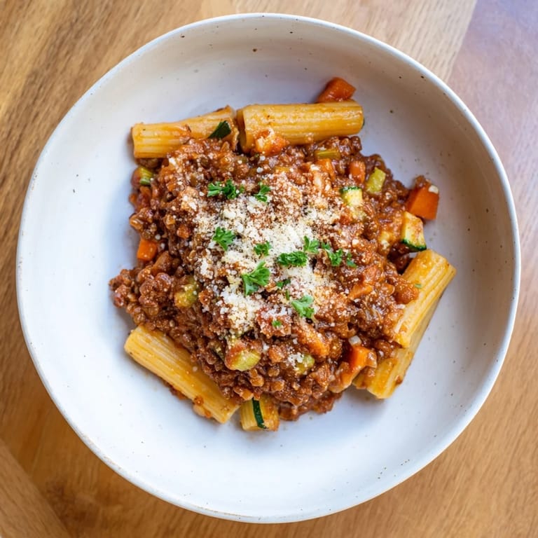 - Lentil Bolognese Sauce: 2 tbsp olive oil, 1 large onion finely chopped, 2 carrots diced, 2 celery stalks diced, 3 cloves garlic minced, 1 red bell pepper diced, 200 g brown or green lentils rinsed, 2 tbsp tomato paste, 800 g canned crushed tomatoes, 500 ml low-sodium vegetable broth, 1 tsp dried oregano, 1 tsp dried thyme, 1 tsp dried rosemary, 1/2 tsp ground cinnamon, 1/4 tsp ground nutmeg, 2 bay leaves, Salt and freshly ground black pepper to taste, 1 tbsp balsamic vinegar, 1 tbsp maple syrup optional for balance