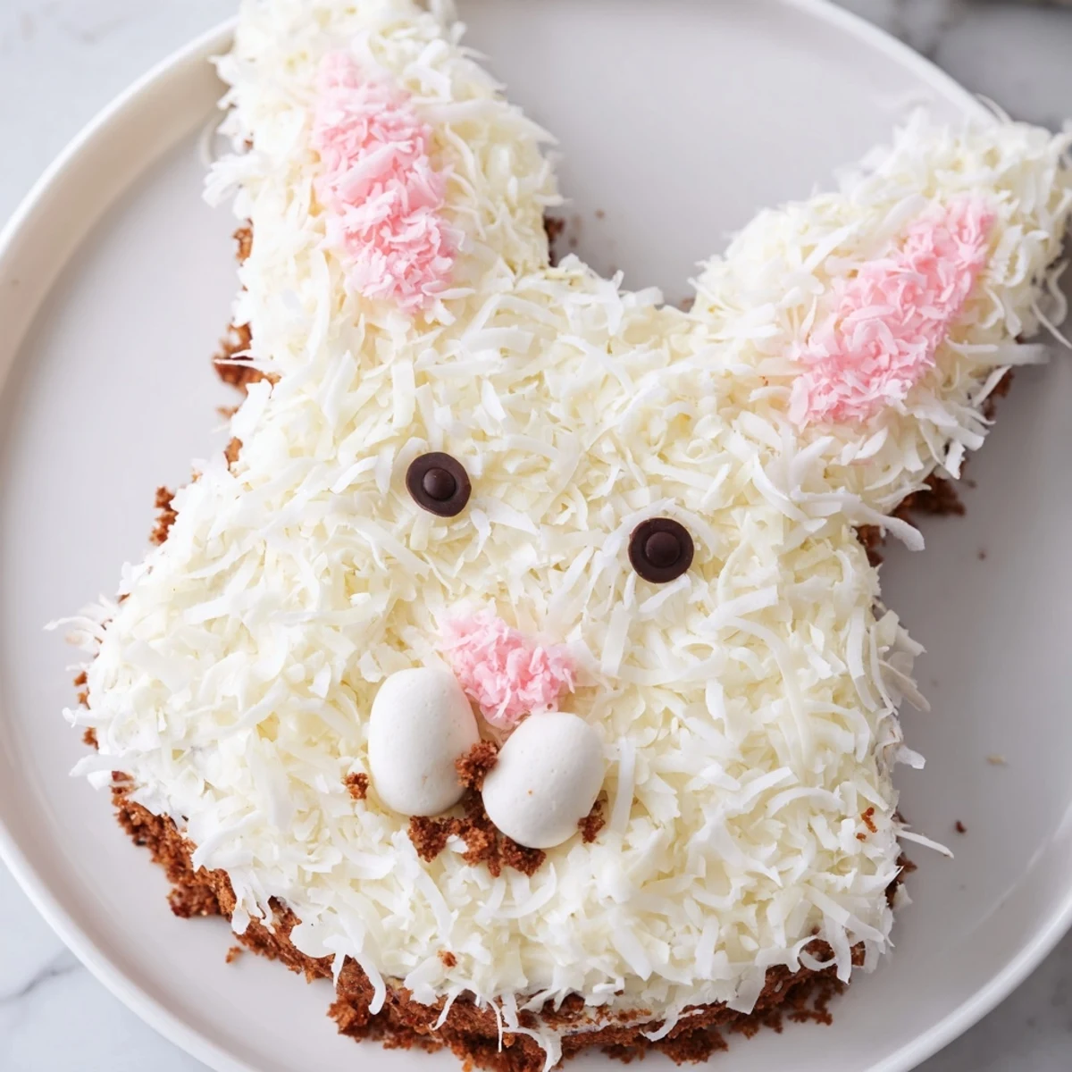 Shredded coconut is sprinkled over the frosting for a fluffy fur effect, with a pink tint applied to parts for signature bunny features.