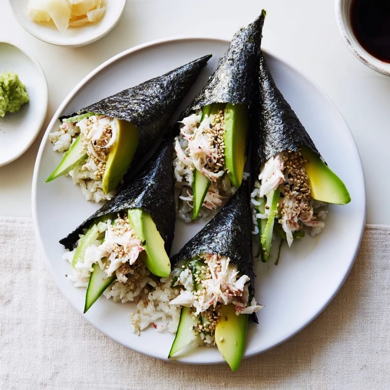 Substitute crab with marinated tofu, grilled vegetables, or pickled vegetables. Tamari can replace soy sauce for a gluten-free option, and omit wasabi if sensitive to spice.